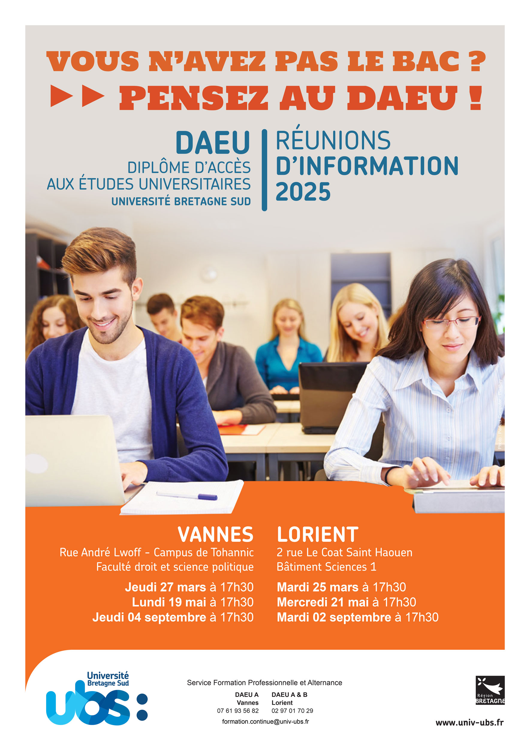 Vous souhaitez candidater au DAEU de l'Université Bretagne Sud : rendez-vous sur la plateforme e-candidat.