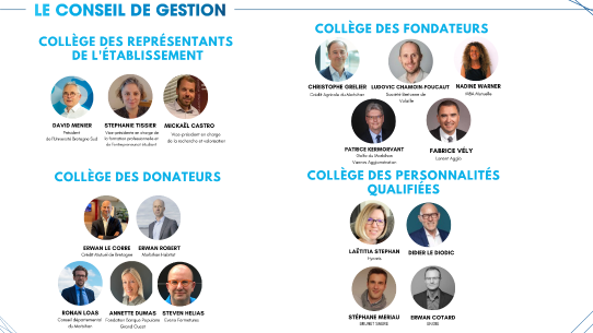 GouvernanceLa Fondation Université Bretagne Sud est administrée par un conseil de gestion composé de trois collèges.